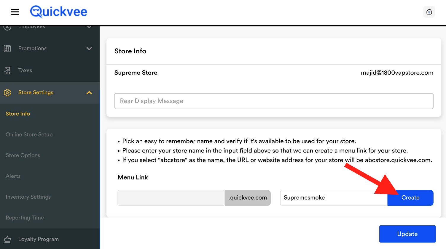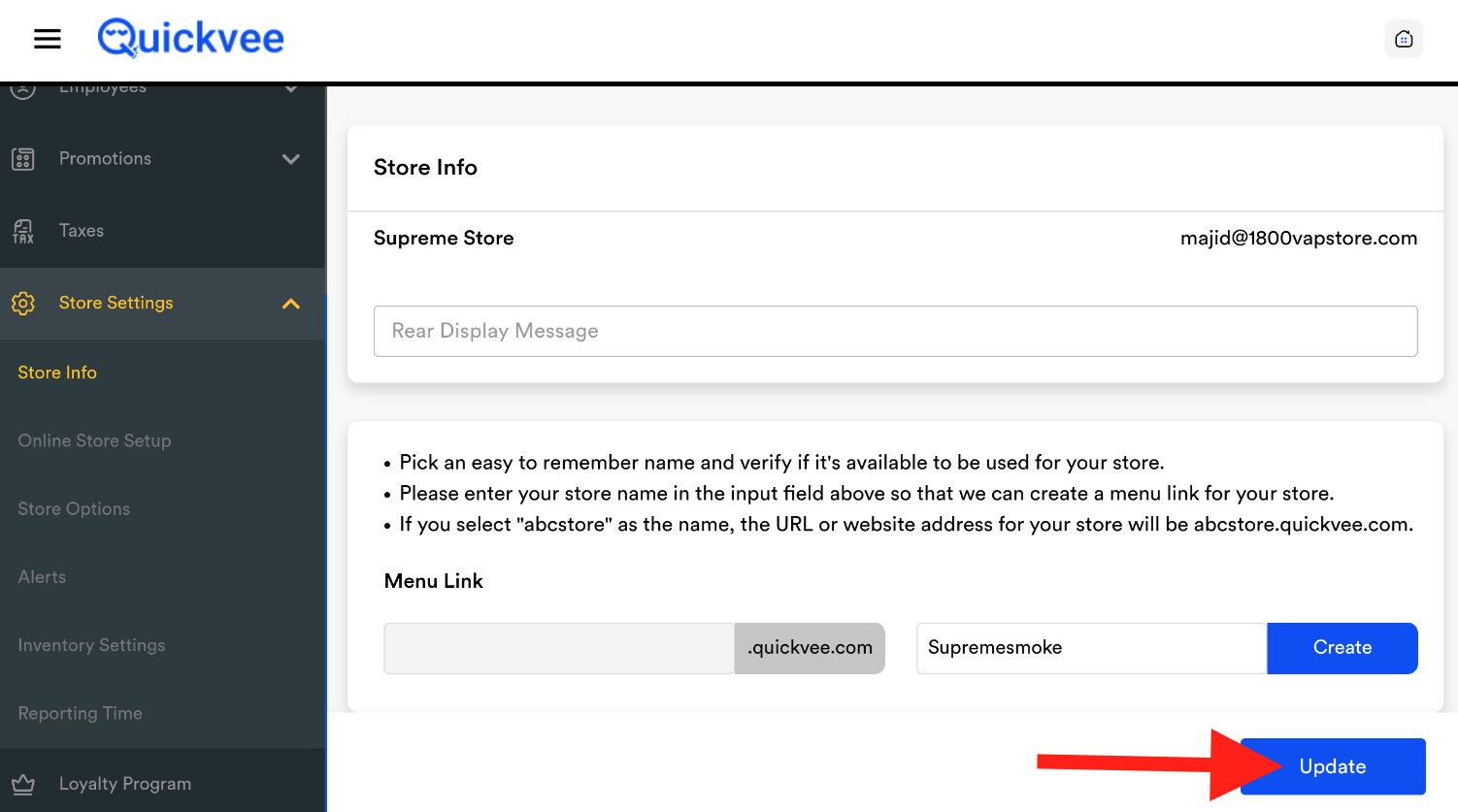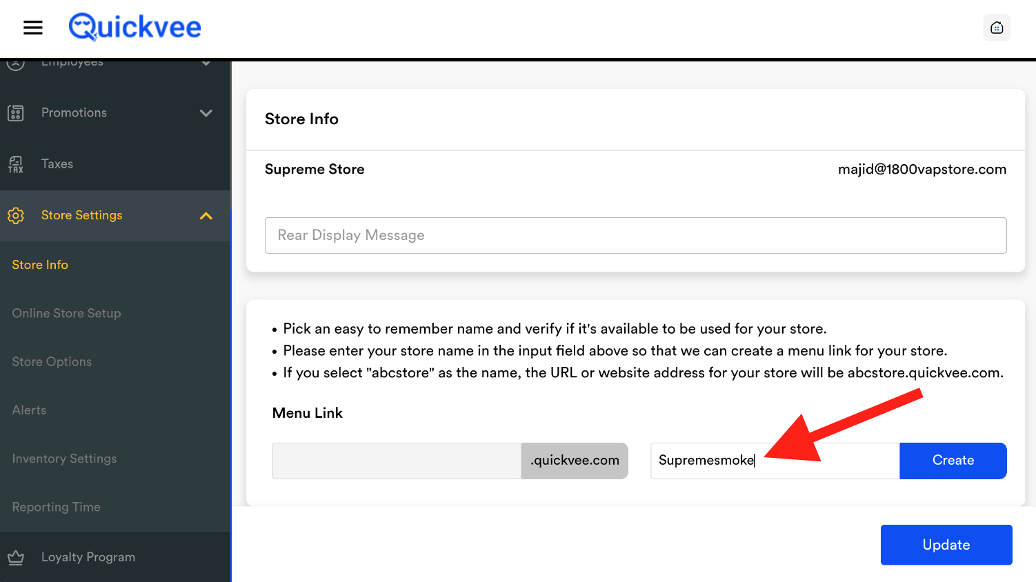 You can customize the preface name that appears before .quickvee.com for your online store. Follow these steps to update your store name: