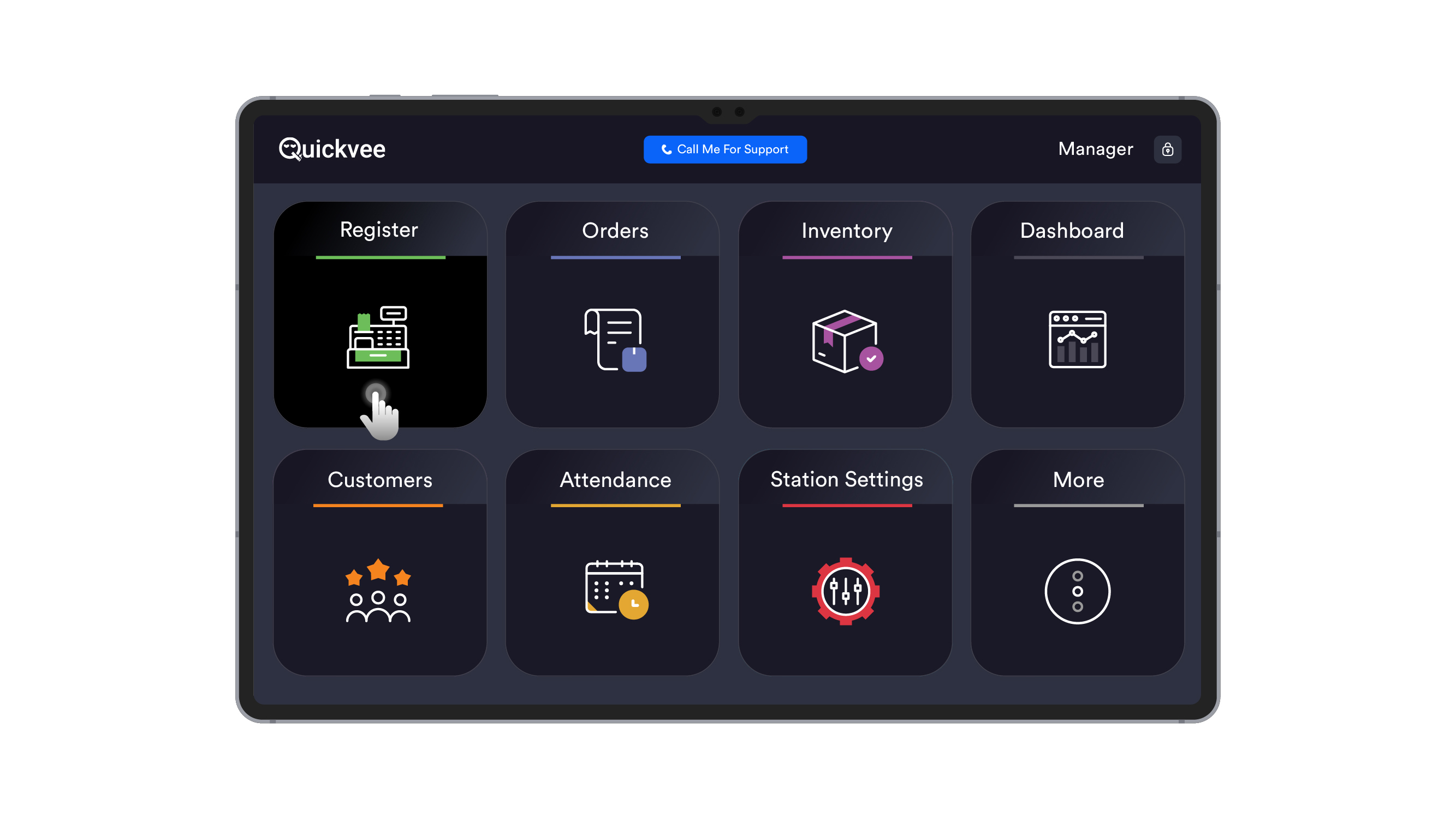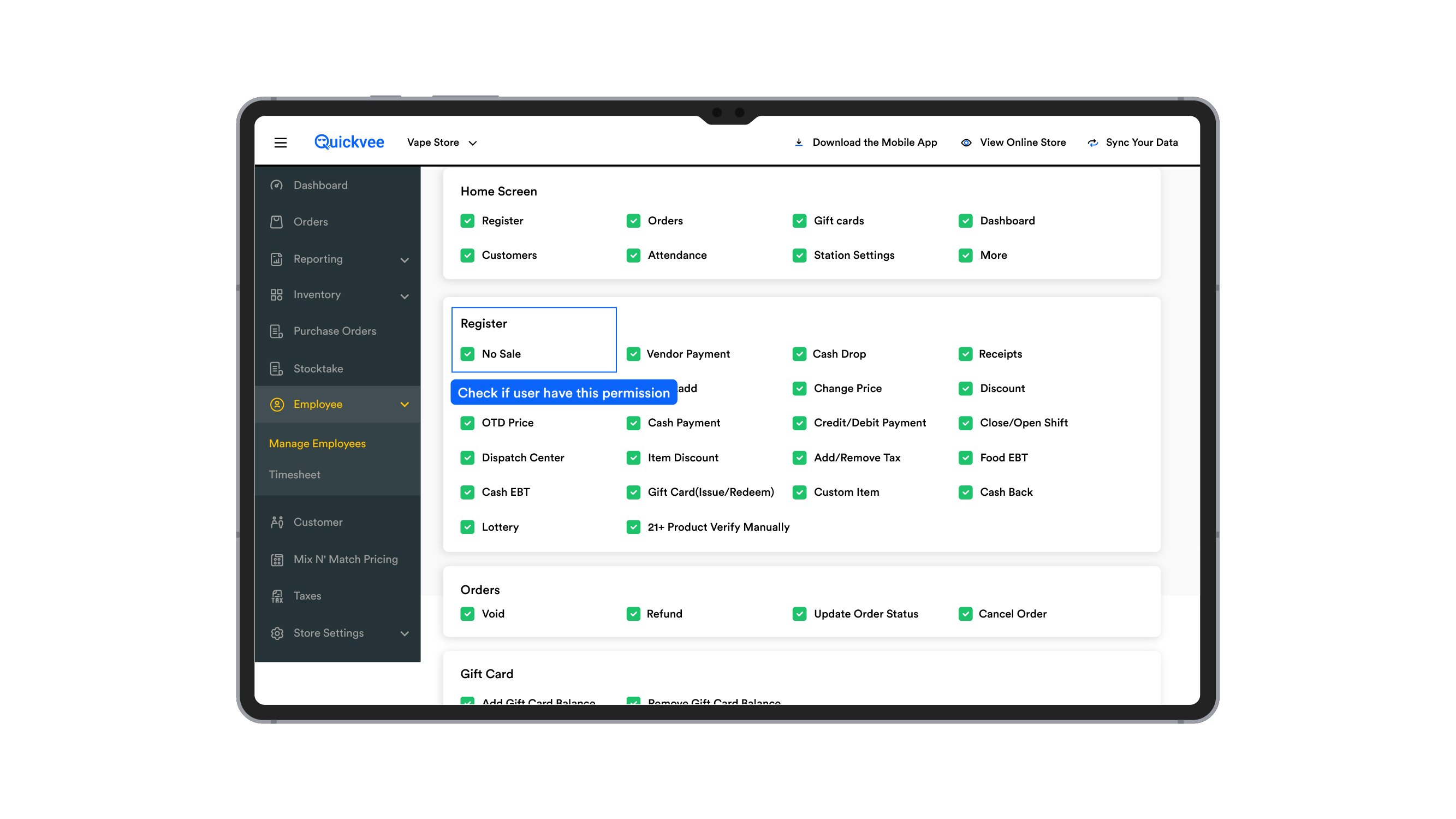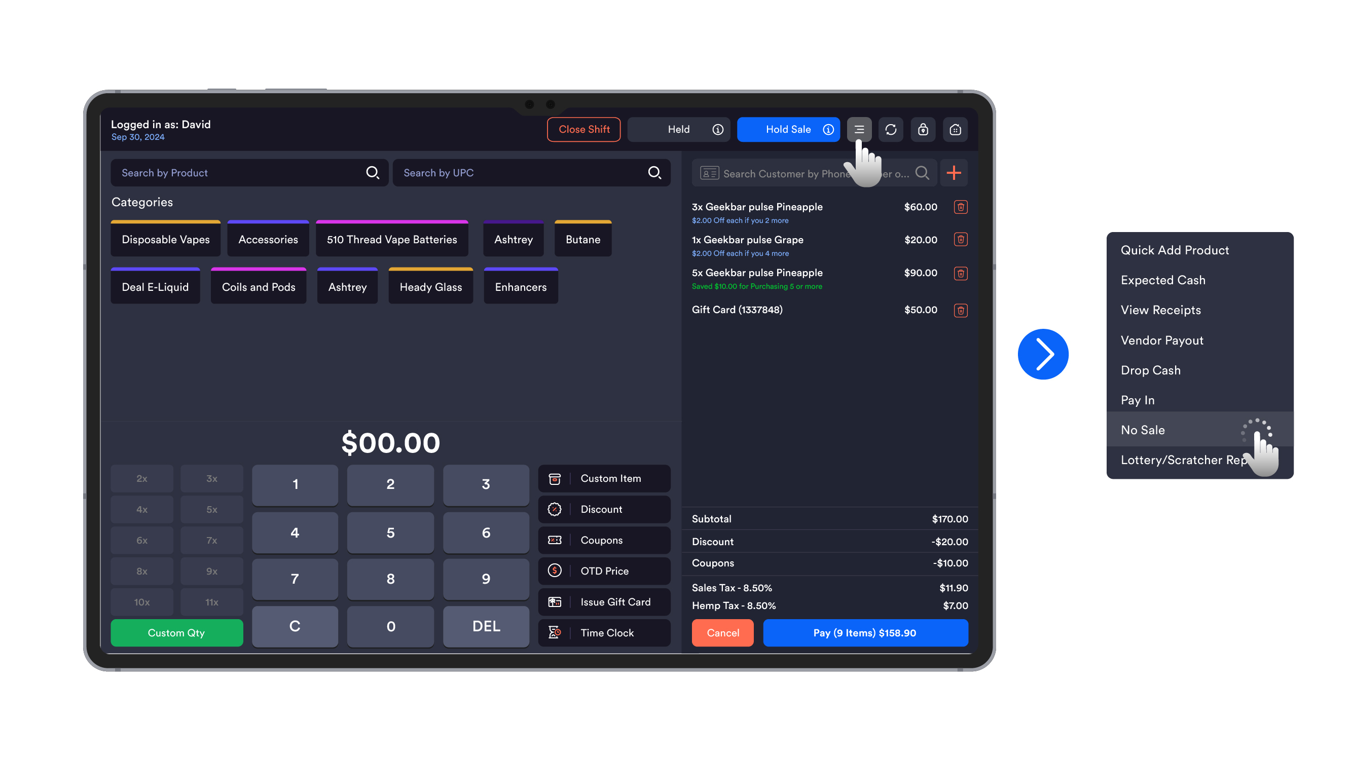 A No Sale action opens the cash drawer without completing a sale and logs the action for reporting purposes. Here’s how to perform a No Sale on Quickvee: