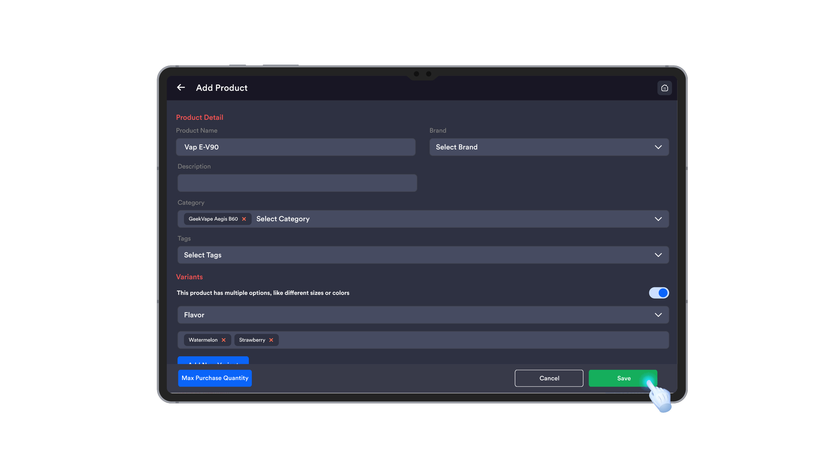 12. Complete Product Details Later: To update additional details for the product (e.g., category, stock, description), navigate to the Inventory screen and edit the product there.