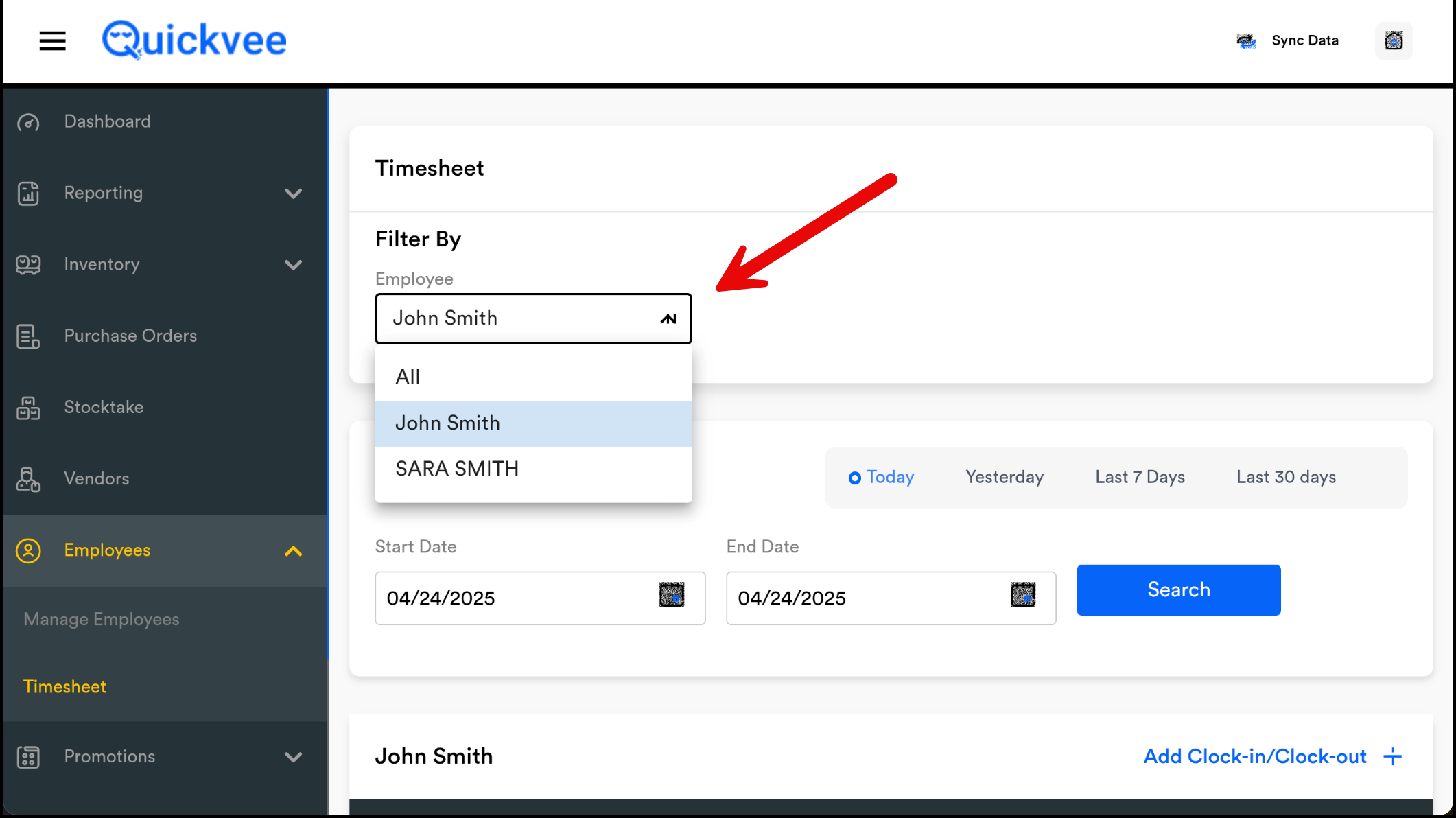 5. Filter by the employee whose timesheet you need to adjust.